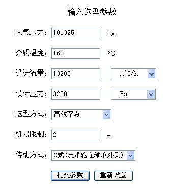 在主菜单中单击【输入选型参数】条目后,就打开输入选型参数的表单页: