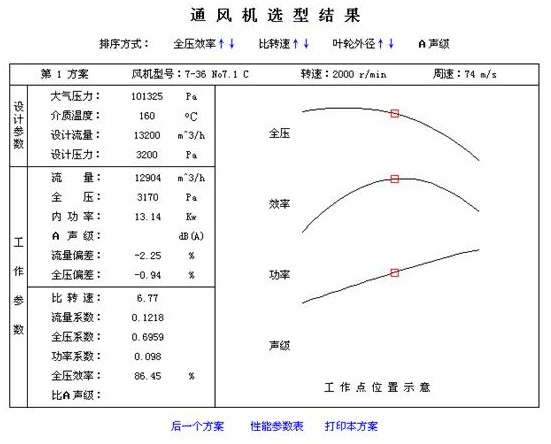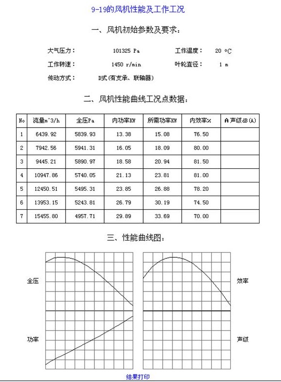 功能:可以查询某一型号风机的风机性能曲线的工况点数据,以及性能曲线图,并提供打印功能。