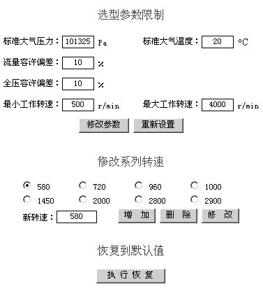 功能:设定选型的允许的偏差范围;设定选型的区域范围;设定风机厂家自己的系列转速。