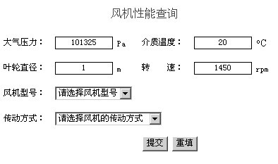 在主菜单中单击【风机性能查询】条目后,就打开输入查询参数的表单页,如下图所示: