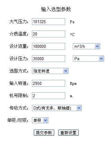 选型实例-硫酸气输送鼓风机选型条件: 流量: 180000m^3/h,全压:Ptr=35000Pa,进口温度:t1=20℃,进口压力 P=101325Pa 使用本站选型功能进行选型:
